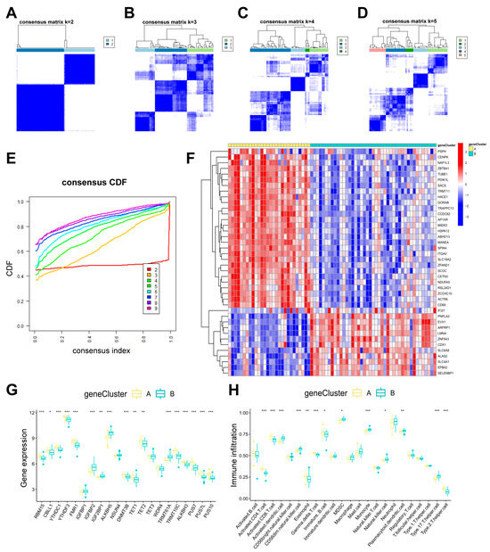 Consensus clustering of 40 RNA modification-related DEGs. (A–D) Consensus matrices of the 40 RNA modification-related DEGs for k values ranging from 2 to 5. (E) The k value of 2 had the smallest descending grade in the consensus CDF curve. (F) Gene clusterA and gene clusterB expression heat maps associated with 40 RNA modification-associated DEGs. (G) Boxplots showing the differential expression of 21 differential RMGs in gene clusterA and gene clusterB. (H) Distinct immune cell infiltration patterns observed in gene clusterA compared to gene clusterB. Statistical annotations: * p < 0.05, ** p < 0.01, and *** p < 0.001.