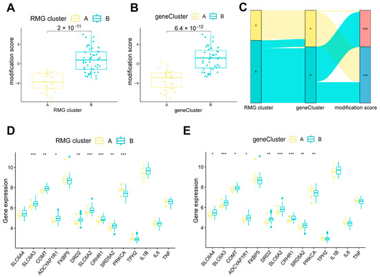 Role of RNA modification subtypes and its gene subtypes in distinguishing PTSD. (A) Differences in modification score between RMG clusterA and RMG clusterB. (B) Differences in modification score between gene clusterA and gene clusterB. (C) Sankey diagram showing the relationship between RNA modification subtypes, RNA modification gene subtypes, and RNA modification scores. (D) Differential expression levels of PTSD-related genes between RMG clusterA and RMG clusterB. (E) Differential expression levels of PTSD-related genes between gene clusterA and gene clusterB. Statistical annotations: * p < 0.05, ** p < 0.01, and *** p < 0.001.