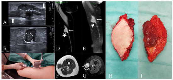 Case 2. (A,B) = Ultrasound images show a well-defined solid subcutaneous soft tissue mass. The tubular structures on both ends (A) correspond with the great saphenous vein (white arrows). Note the mural thickening of the great saphenous vein (B), which is encased by the mass (white circle). (C) = Ultrasound-guided core needle biopsy. The biopsy should be planned so that the biopsy tract can be safely removed at the time of definitive surgery. (D,E) = Sagittal post-contrast CT and sagittal post-contrast T1W fat-suppressed images reveal mural thickening of a segment of the great saphenous vein (white arrows) and a polylobate soft tissue saphenous-dependent mass (white stars). (F) = Axial T1W images exhibit a well-circumscribed, isointense to muscle, and subcutaneous soft tissue mass. (G) = DP fat-suppressed axial image shows the hyperintensity of the mass and its relationship with the great saphenous vein (white circle), well correlated with transverse grayscale US (B). (H) = Superficial side of the specimen, including a large segment of skin. (I) = Deep side of the specimen, including the fascia and a muscular cuff to ensure a wide resection margin. Note the inclination of the biopsy needle so as not to cross the fascia and avoid contamination of healthy deep planes of the thigh. Also note the peripheral sealing of the specimen by means of stitches between the skin and the fascia (H).