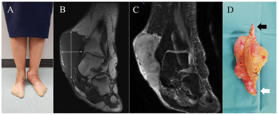 Case 6. (A) = Clinical appearance of a woman with a large tumor on the inner aspect of her left ankle. (B,C) = Coronal T1-weighted and coronal T2-weighted, fat-suppressed MR images exhibit a giant subcutaneous lobulated nonspecific mass (blue arrows). In this case, continuity with vascular structures was not established, probably due to its large size. The lesion is in contact with tibial epiphysis, but no associated osseous changes were demonstrated. (D) = Specimen with marginal margin of resection. The skin island that includes the biopsy tract is identified; the ends of the great saphenous vein are indicated: proximal end (black arrow) and distal end (white arrow).