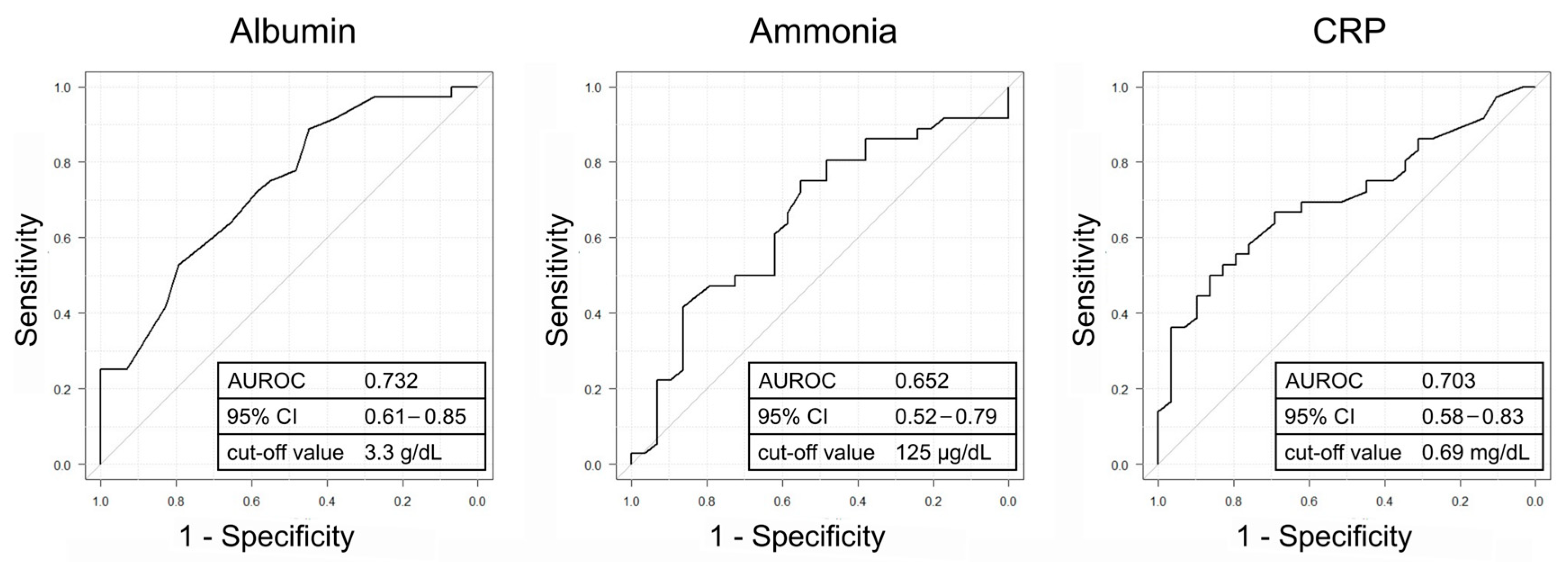 | Ammonia [μg/dL] | <125 vs. ≥125 | 3.20 | 1.14–8.99 | 0.027 | 2.32 | 0.62–8.75 | 0.213 |