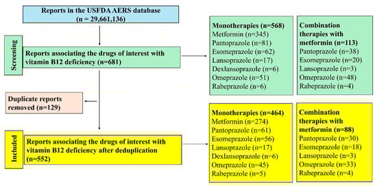 A total of 29,661,136 reports existed in the database during the study period of which 552 were included in the final analysis (Figure 1). Metformin had the maximum number of reports (n = 274) followed by pantoprazole (n = 61) amongst the monotherapies and amongst the combinations, metformin with omeprazole (n = 33) had the most reports associated with vitamin B12 deficiency.