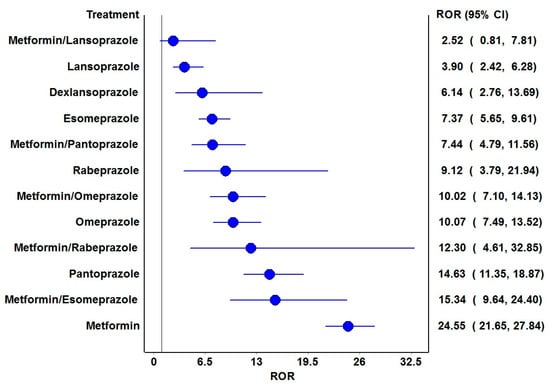 Reporting odds ratios of the drugs and their combinations. ROR: Reporting odds ratio. The blue circles represent the ROR, and the blue horizontal lines represent 95% CI of RORs. The vertical black line represents the line of no difference in the risk of vitamin B12 deficiency.