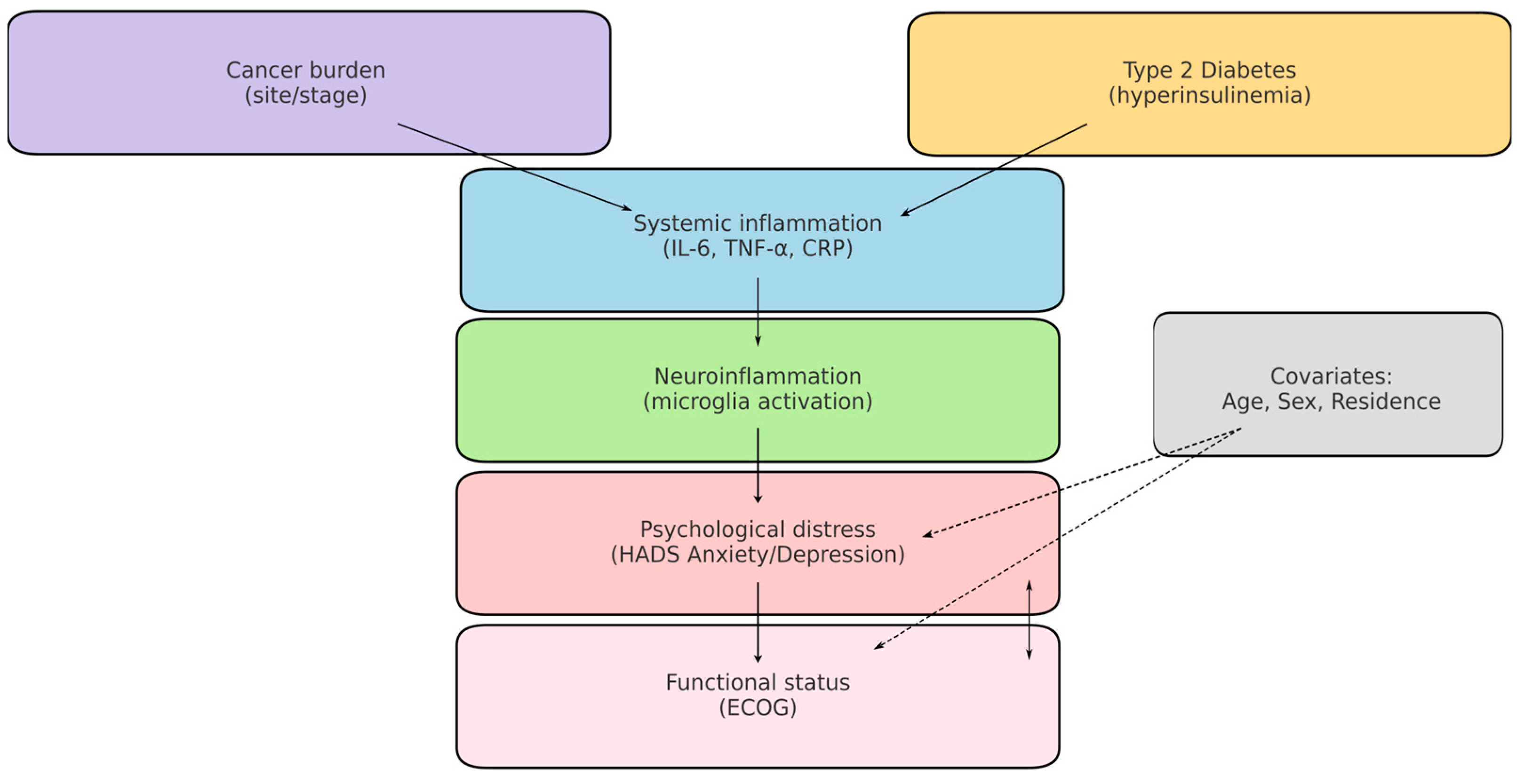 Our findings support the idea that psychological distress is widespread among cancer patients, regardless of diabetes status, but the additional challenge of managing coexisting T2DM may require more careful attention. Interventions that target IL-6, oxidative stress, or microglial activation could serve as promising translational strategies to reduce both psychiatric symptoms and systemic disease progression. Future research should explore biomarkers of neuroinflammation (e.g., CRP, IL-6, kynurenine pathway metabolites) to better define risk profiles and tailor supportive care.