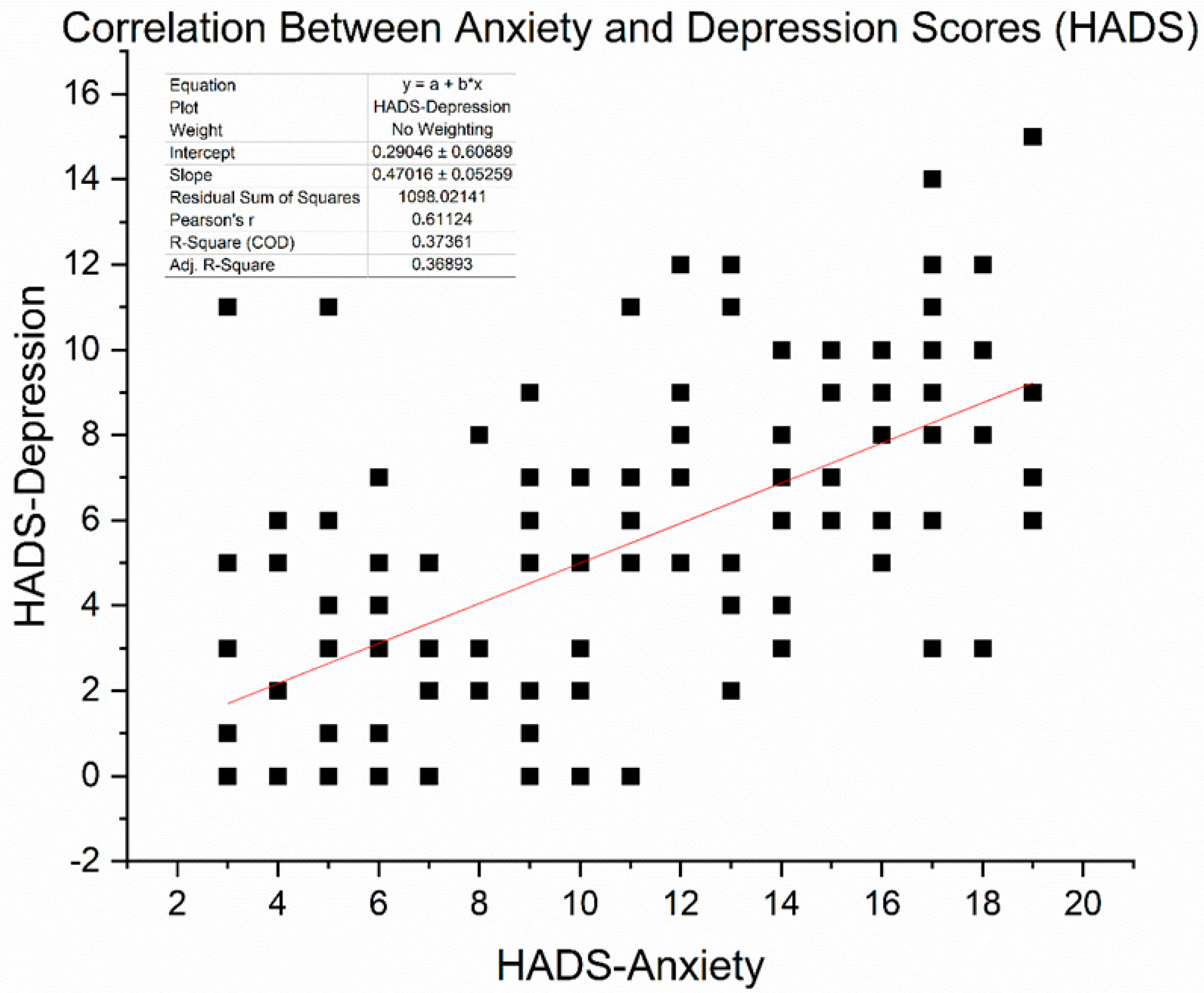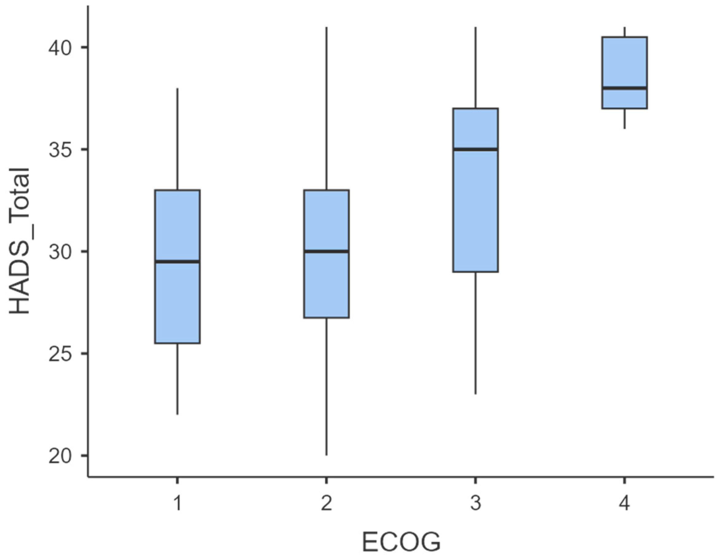 One of the most salient findings in our study was the relationship between performance status and psychological distress. We found a moderate, statistically significant positive correlation between ECOG score and HADS total score (Spearman ρ = 0.414,