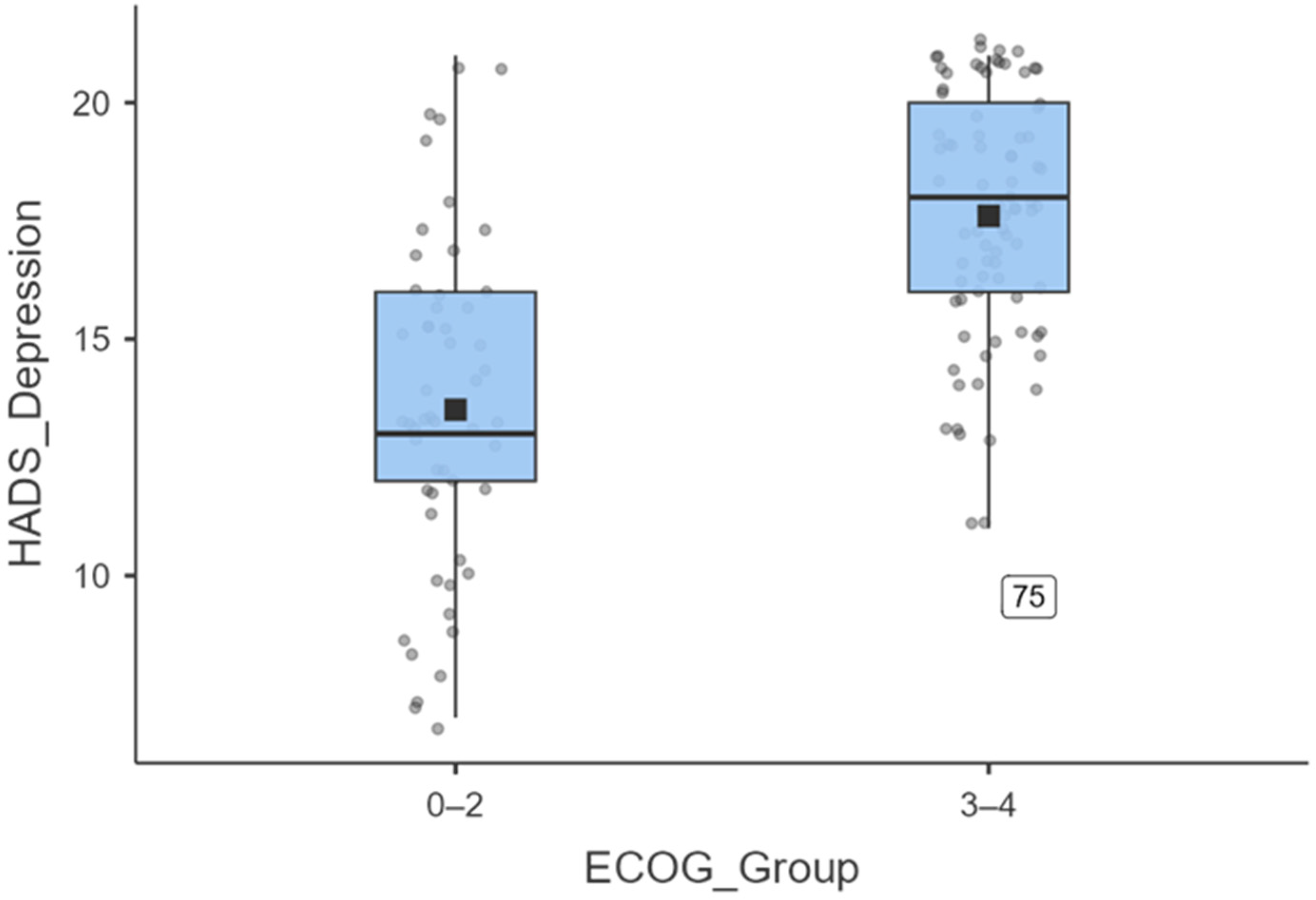 p < 0.001), indicating that patients with worse functional status (higher ECOG) tended to report higher levels of combined anxiety/depression [