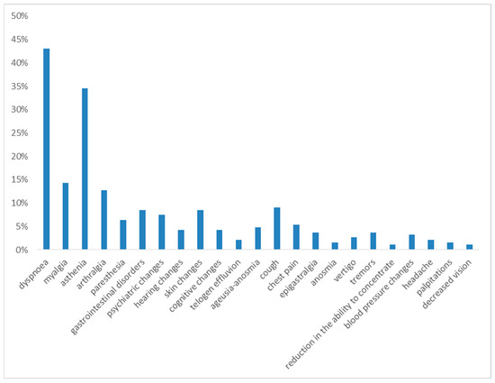 The next most frequent symptoms were myalgia (11%), psychiatric alterations (11%), telogen effluvium (11%), arthralgia (9%), cognitive alterations (9%), gastrointestinal disorders (7%), paresthesia (7%) and skin alterations (7%). With a prevalence of less than 5%, the following were reported: cough (4%), hearing alterations (3%), dizziness (3%), chest pain (1%), tremors (1%), blood pressure changes (1%), headache (1%), palpitations (1%) and decreased vision (1%) (Figure 2).