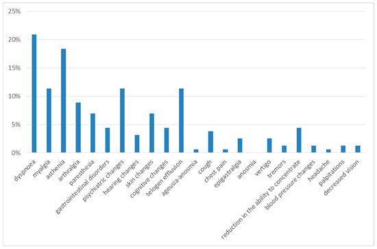 The specific symptoms manifest themselves at the respiratory, cardiovascular, neurological, gastrointestinal, and psychological levels [3,4,5]. Examples include dyspnea, persistent cough, chest pain and feelings of oppression, tachycardia and palpitations, and changes in blood pressure. Headaches; difficulty concentrating and remembering (the so-called “brain fog”); disorders of smell, taste, and hearing; nausea and vomiting; loss of appetite; abdominal pain; diarrhea; and gastroesophageal reflux are also reported as symptoms. The dermatological system can be involved, including instances of rash, alopecia, and telogen effluvium [6,7]. Sleep disturbances, depressed mood (sadness, irritability, intolerance, lack of interest in previously enjoyed activities), anxiety, stress, and psychosis are other symptoms related to the central nervous system [8].