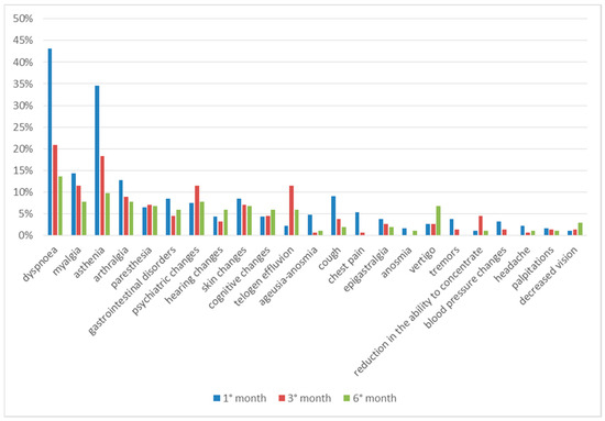 The symptoms reported most frequently throughout the observation period were dyspnea, asthenia, myalgia and arthralgia. The percentage of patients presenting these symptoms, although decreasing during the follow-up, remained the highest throughout the observation period, thus making it possible to define these as the main symptoms of long COVID.