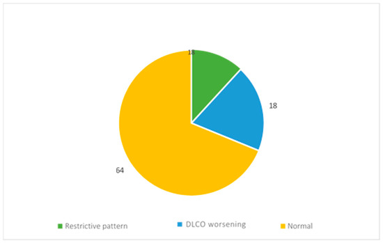 During the follow-up, the evaluation of functionality was performed by spirometry and alveolar–capillary diffusion of carbon monoxide (DLCO).