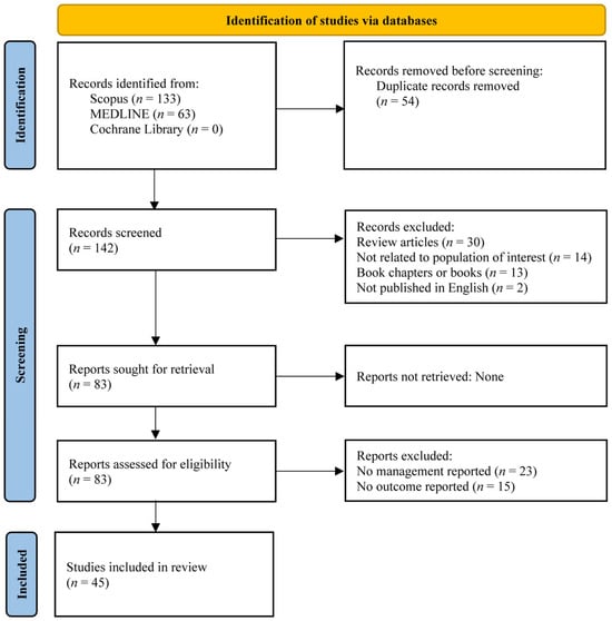 The search was limited to studies published in English between January 2005 and July 2025 to capture contemporary evidence while excluding outdated treatment approaches. Only peer-reviewed articles were included. Eligible study designs comprised randomized controlled trials, prospective and retrospective studies, case reports, case series, and letters. Studies that did not report treatment interventions or clinical outcomes were excluded along with reviews, conference papers, book chapters, books, and non-peer-reviewed materials. All identified records were exported to a reference management tool, and duplicates were removed. Two reviewers independently screened the titles and abstracts, followed by a full-text review based on the predefined eligibility criteria. Reference lists of the included studies were examined using additional relevant sources. The PubMed search strategy is presented here as an example and has been adapted for use in other databases. The PubMed search strategy is exemplified and subsequently adapted for use in Scopus and the Cochrane Library by modifying the field tags and controlled-vocabulary terms to reflect the indexing conventions for each database. The adapted search strings for all databases are offered in Supplementary Table S1 and are provided for transparency and reproducibility.