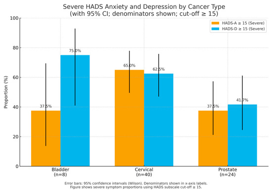 Psychological morbidity was not evenly distributed by tumour site. Patients with urogenital malignancies—especially those with cervical cancer—showed the most pronounced distress, with near-universal mixed anxiety–depressive presentations in our sample; bladder and prostate cancers also exhibited high rates, though less uniformly. These gradients are consistent with recent reports in gynaecologic oncology showing high point prevalences of anxiety and depression in cervical cancer (often >40–60%) and a sustained need for psychosocial support in this population [22,23].