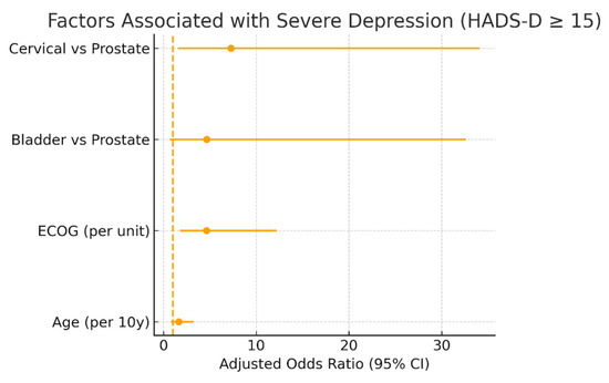 An exploratory model using the higher HADS-D ≥ 15 threshold is shown in Figure 2, illustrating the same direction of associations observed with the primary cut-off (HADS-D ≥ 11). This stricter threshold highlights the robustness of the relationship between poorer functional status (ECOG) and depressive symptom severity, although confidence intervals are wider due to smaller subgroup sizes.