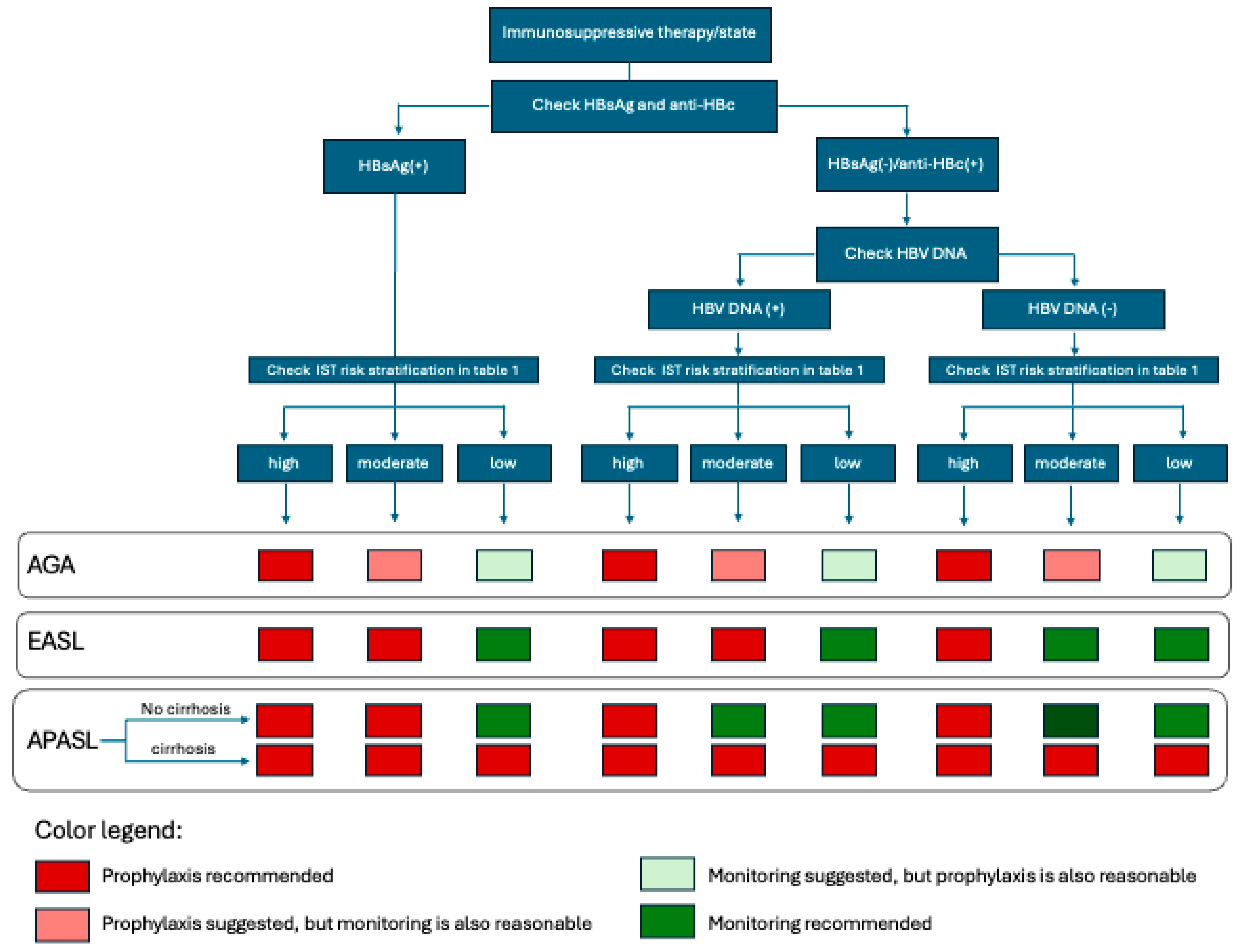 In the AGA guidelines, this group includes patients who are on anti-T cell therapy, immune checkpoint inhibitors, anthracyclines, anti-TNF agents, tyrosine kinase inhibitors, cytokine or integrin inhibitors, CAR-T cell therapy, anti-interleukin 6 agents, or JAK inhibitors. Notably, in the AGA guidelines, patients on immune checkpoint inhibitors are considered moderate risk whether they are HBsAg positive or HBsAg negative/anti-HBc antibodies positive [14]. The EASL guidelines mostly agree with the AGA except that they do not have specific recommendations for the patients who are on anti-IL6 or immune checkpoint inhibitors. They have separate recommendations for some cytokine or integrin inhibitors and specifically classify patients on anti-IL 12/23 and anti-IL 17 in this risk group [25]. They also differ from the AGA by placing the patients on anthracyclines therapy in the high-risk group. The APASL guidelines agree with placing the patients on anti-TNF agents in this group; however, they make a distinction for etanercept, since it has lower potency, and place patients that are on it in the low-risk category. APASL does not offer generalized recommendations for cytokine or integrin inhibitors. Their guidelines also do not offer recommendations for CAR-T cell therapy, anti-T cell therapy, and anti-IL6 therapy, and they place those receiving tyrosine kinase inhibitors in the low-risk group. The APASL guidelines, compared to the AGA guidelines, do not offer specific recommendations for patients that are HBsAg negative/anti-HBc positive and on immune checkpoint inhibitors [26].
