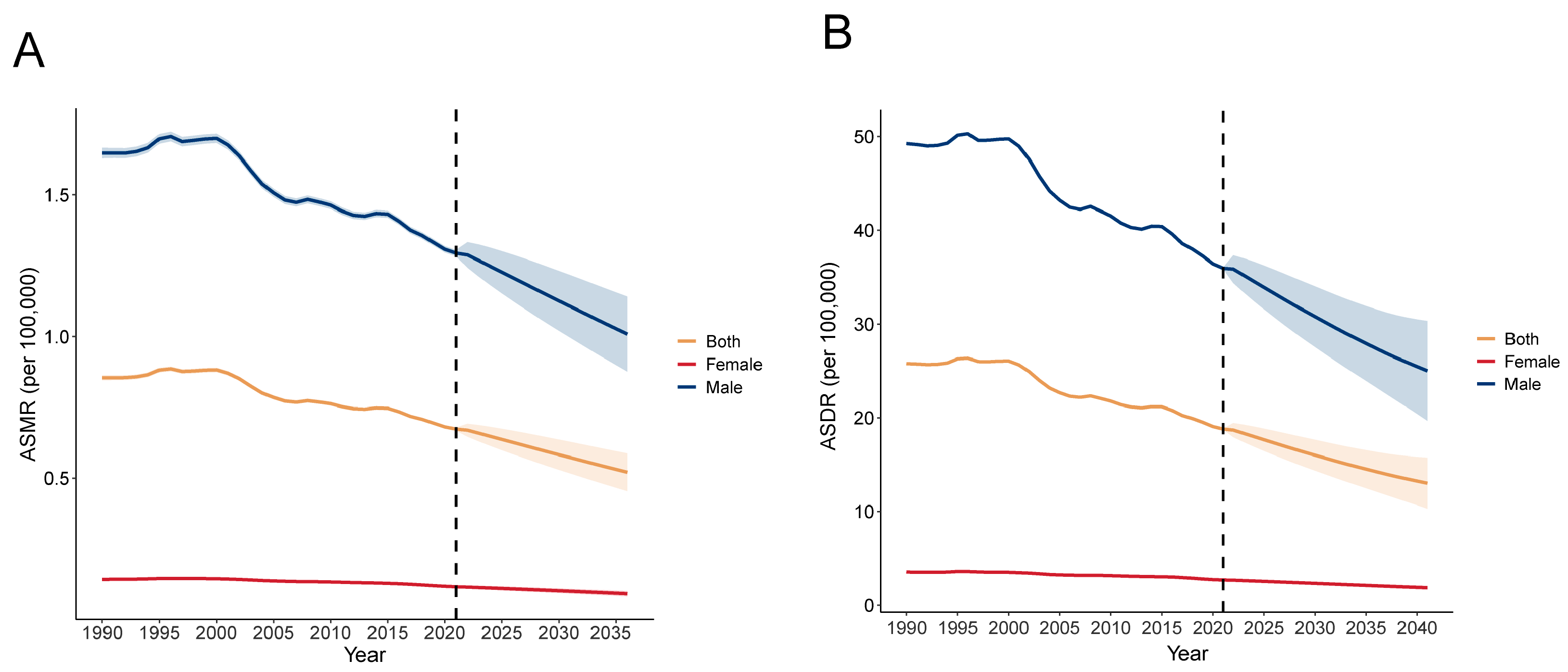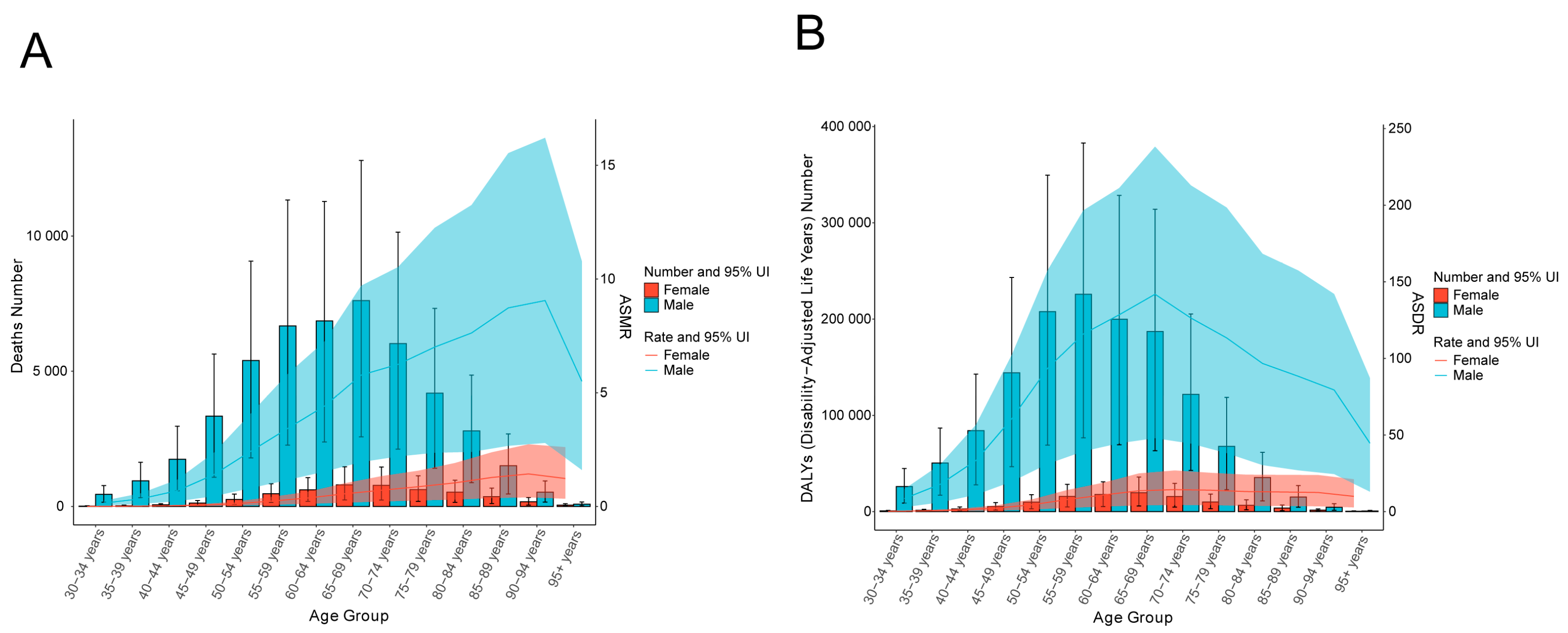 3.2. Temporal Trend of Smoking-Related Liver Cancer Burden from 1990 to 2021