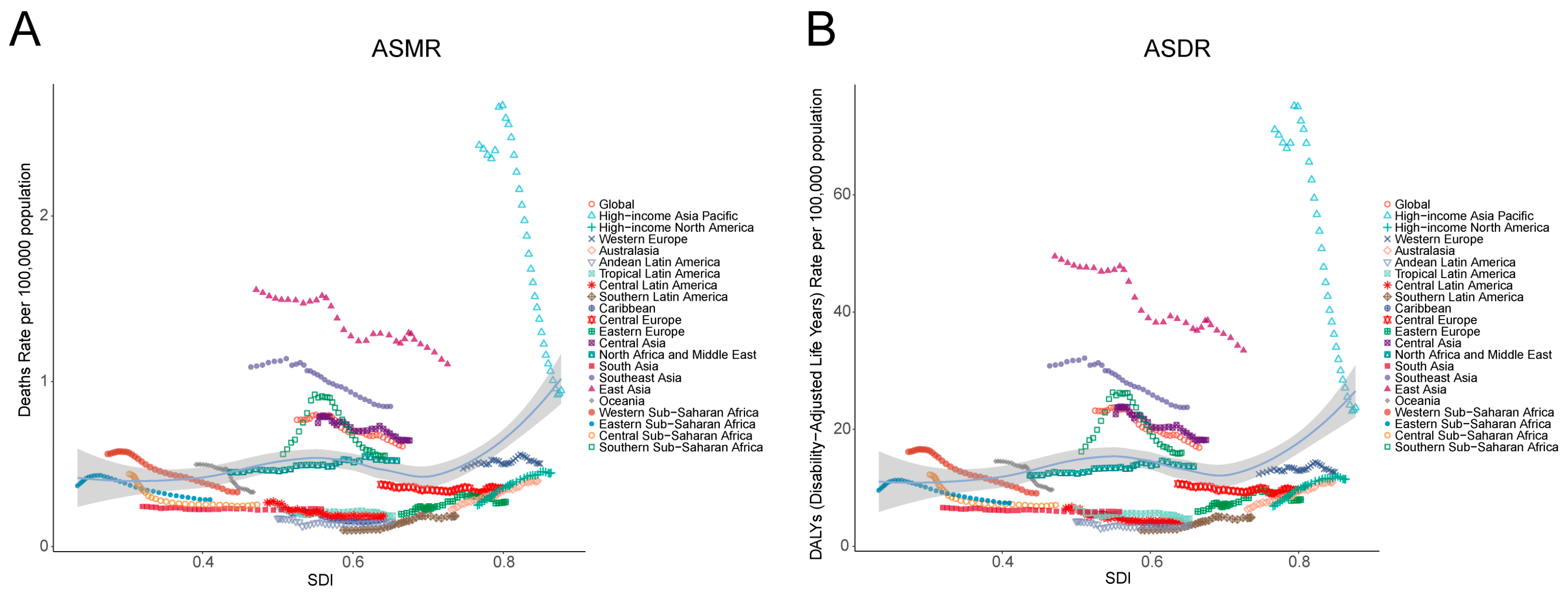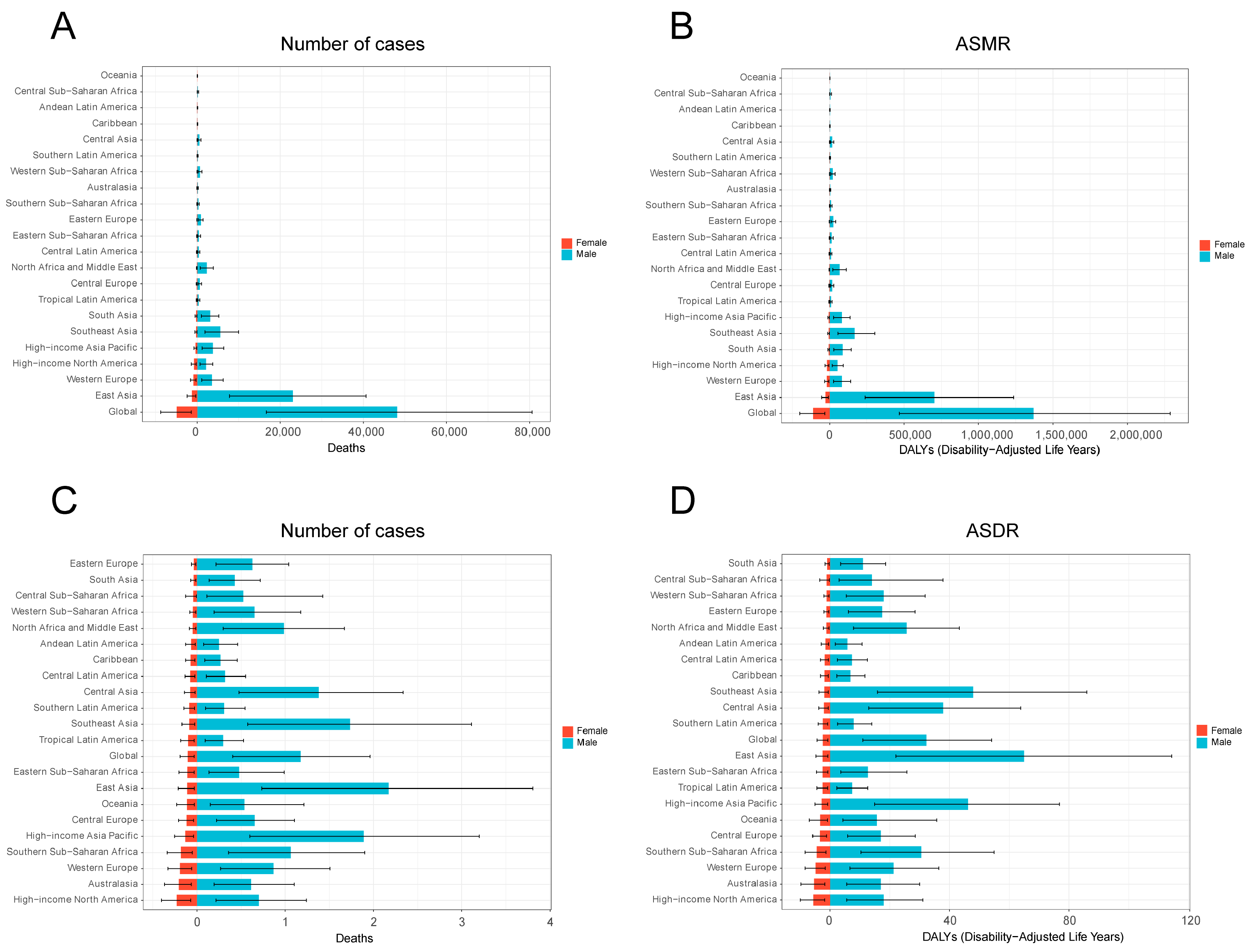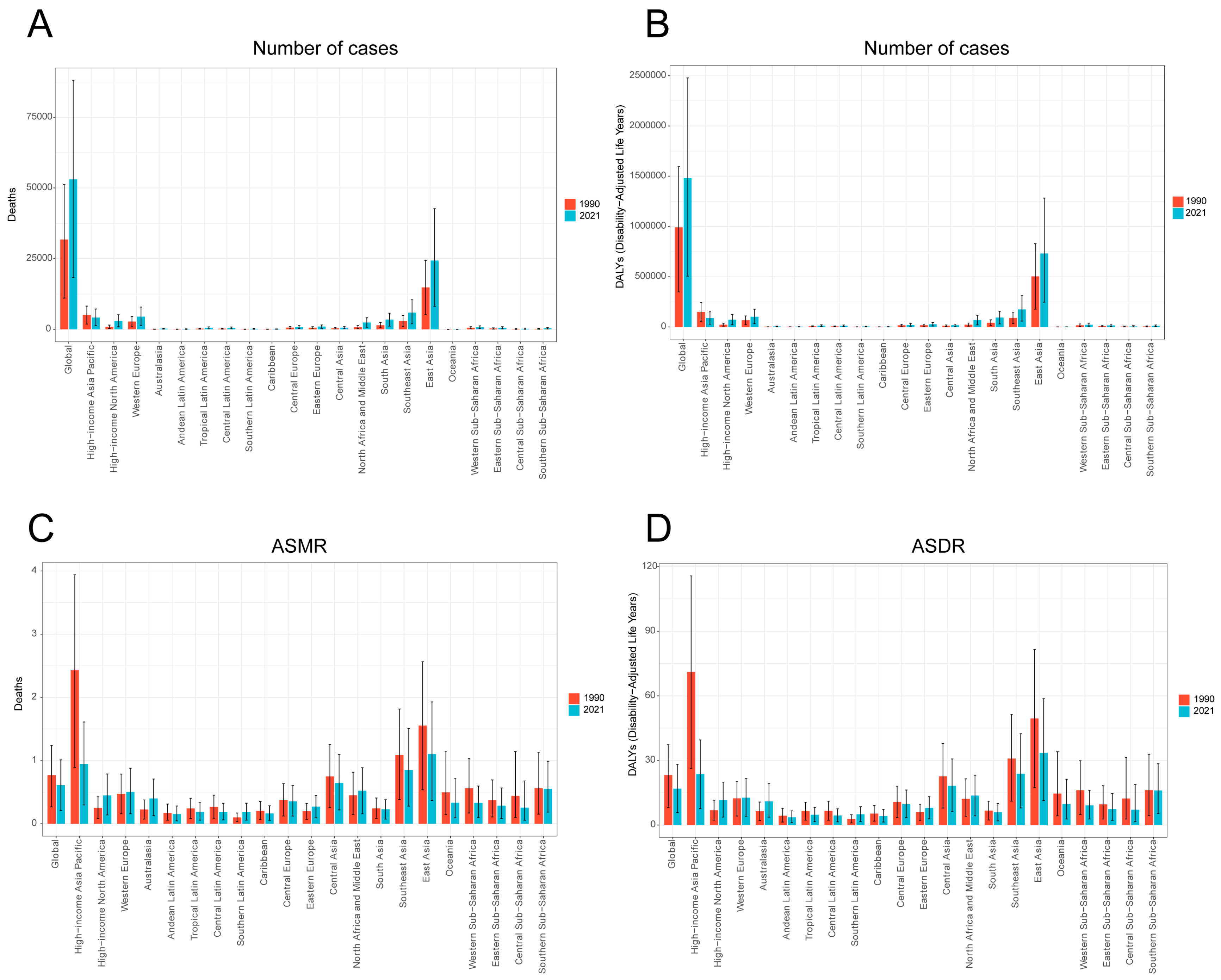 | Number of Death Cases (95% UI) | ASDR/100,000 (95% UI) | Number of Death Cases (95% UI) | ASDR/100,000 (95% UI) | EAPC (95% CI) | Trend | ||