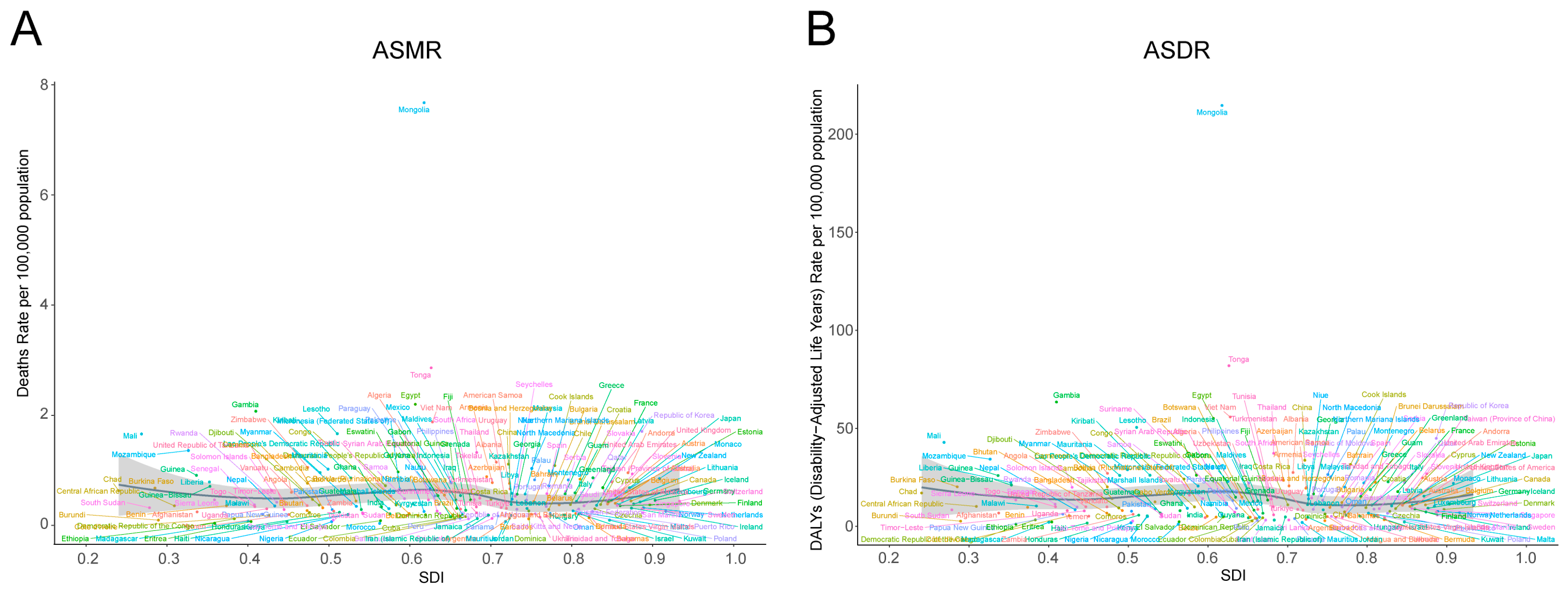 | Global | 991,836.337 (348,071.515–1,595,195.380)  | 23.191 (8.129–37.308)  | 1,482,896.286 (504,999.552–2,478,905.619)  | 16.903 (5.755–28.259)  | −1.121(−1.241–−1.001) | Down | |