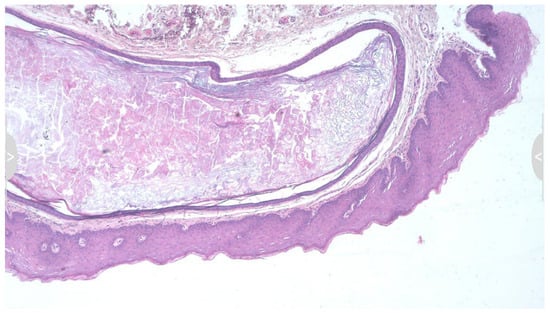- Kumar, P.; Malhotra, R.; Urs, A.B.; Augustine, J.; Mohanty, S. Epidermoid cysts of the orofacial region: A clinico-pathological study of 13 cases. Indian J. Pathol. Microbiol. 2023, 66, 568–572. [Google Scholar] [CrossRef] [PubMed]