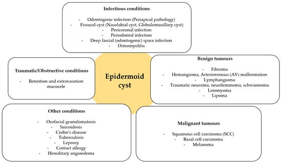 - Adhikari, M.; Jha, K.; Thapa, P.; KC, S.; Neupane, P.R.; Poudel, P. Orofacial epidermoid cysts: A case series. Clin. Case Rep. 2025, 13, e70374. [Google Scholar] [CrossRef] [PubMed]