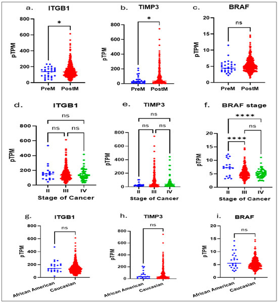 The Cancer Genome Atlas (TCGA) and The Human Protein Atlas, which provide comprehensive genomic and proteomic profiles across multiple cancer types, we performed an integrative bioinformatic analysis. Multivariate analysis of the TCGA data showed: significant differences between pre and postmenopausal expressions of ITGB1 (a) and TIPMP3 (b) genes, whereas no significance in BRAF (c); in stage II to Stage IV: there are no significant differences shown in expressions of ITGB1 (d) and TIPMP3 (e) genes; a higher significance in BRAF expression (f) between Stage II to Stage III and Stage II to Stage IV is shown. No racial significance was observed in ITGB1 (g), TIMP3 (h), and BRAF (i) expressions. An unpaired t-test with Welch’s correction (a–c,g–i) or One-way Anova (d–f) is performed. * Indicates a p ≤ 0.02 and **** indicates p < 0.0001.; ns, not significant, indicates a p > 0.05 or more.