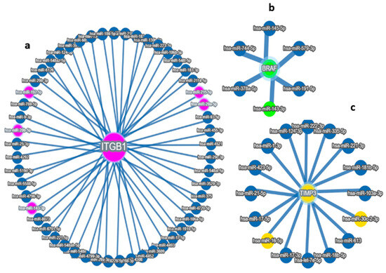 To further explore the post-transcriptional regulatory mechanisms underlying these race-associated disparities, we examined the relationship between key microRNAs (miRNAs) and the previously identified prognostic genes (TIMP3, BRAF, and ITGB1) using integrated analyses of the TCGA and Human Protein Atlas datasets. This approach allowed us to identify potential miRNA–mRNA regulatory interactions that may modulate gene expression and influence survival outcomes across racial groups.