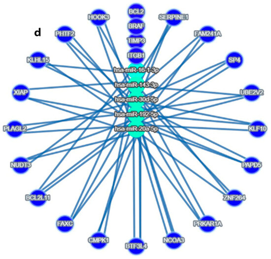 Target MicroRNas Linked to Prognostic Markers: (a–d): (a) miR-192, hsa-miR-16-5p, miR-143-3p, and miR-20a-5p are linked to ITGB1, (b) miR-143-3p/miR-145-5p is linked to BRAF, (c) hsa-miR-16-5p and miR30c/d are linked to TIMP3 prognostic markers, (d) Integrated miRNA–gene interaction network associated with serous ovarian cancer prognosis. The diagram illustrates predicted and validated regulatory interactions between key microRNAs (miR-192-5p, miR-30d, miR-16-5p, miR-143-3p, miR-20a-5p) and their target prognostic genes (ITGB1, TIMP3, BRAF). Circles represent miRNAs; ovals represent target genes. Solid lines denote experimentally validated interactions (from miRTargetLink 2.0); Color coding: Turquoise Blue = miRNA nodes; Royal blue = prognostic genes; edge thickness corresponds to interaction with confidence. The figure highlights key regulatory axes-miR-192 → ITGB1, miR-30d → TIMP3, and miR-143 → BRAF-that may influence racial disparities and survival outcomes in serous ovarian cancer.