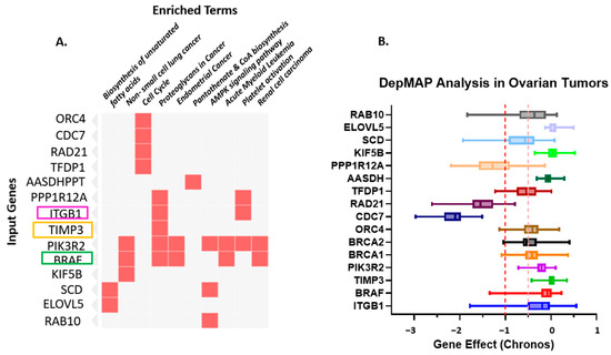 (A). Gene–Pathway Enrichment Heatmap. The heatmap illustrates the relationship between input genes and enriched biological pathways or functional terms. The rows represent the input genes (e.g., ORC4, CDC7, RAD21, TFDP1, PIK3R2, BRAF, KIF5B). At the same time, the columns correspond to enriched terms identified through pathway enrichment analysis (e.g., Biosynthesis of unsaturated fatty acids, non-small cell lung cancer, Cell cycle, Proteoglycans in cancer, Endometrial cancer, Pantothenate and CoA biosynthesis, AMPK signaling pathway, Acute myeloid leukemia, Platelet activation, Renal cell carcinoma). Red squares indicate a gene–pathway association, where a given gene contributes to the enrichment of that pathway. The intensity of the red color denotes the strength of the association or significance level (darker shades represent higher relevance or enrichment scores). This visualization highlights key genes (TIMP3, BRAF, and ITGB1, among the top 10 genes) that participate in multiple cancer-related and metabolic pathways, suggesting potential functional hubs and crosstalk among signaling networks. highlighting ITGB1, TIMP3 and BRAF. (B). Depmap analysis of Ovarian Tumors: Dependency of Ovarian Tumors on the Prognostic Markers. The dependency on prognostic markers (ITGB1, TIMP3, and BRAF) compared to other important factors in Ovarian cancer was analyzed using CRISPRi/RNAi data available from the Cancer Dependency MAP website. A gene effect value closer to “0” indicates no survival dependency, whereas “−1” indicates very high dependency. Different colors are used to identify different genes. The red dotted line indicates the cut-off value of downregulated genes; orange dotted lines indicate overlapping expression of all genes.