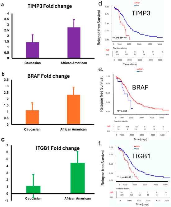 (a–f): Expression of TIMP3, BRAF, and ITGB1 in LLU and TCGA ovarian cancer cohorts stratified by race. (a–c): Bar plots show relative expression (fold changes) of TIMP3 (p = 0.02) (a); BRAF (p = 0.84, not significant) (b), and ITGB1 (p = 0.01) (c) (two-tailed t-test) in ovarian tumor samples from the LLU cohort, comparing Caucasian and African American patients. Data are presented as mean ± SEM. (d–f): TCGA data analysis revealed a significant correlation between ITGB1, TIMP3, and BRAF gene expression and survival. These prognostic gene expression patterns (high or low) are significantly associated with patient survival: higher expression of TIMP3 (*** p = 0.000046) (d), lower BRAF (* p = 0.05) (e), and higher ITGB1 (*** p = 0.000056) (f) correlates with poor survival. * p < 0.05; *** p < 0.001. The red line graph indicates high expression, and the blue line indicates low expression.