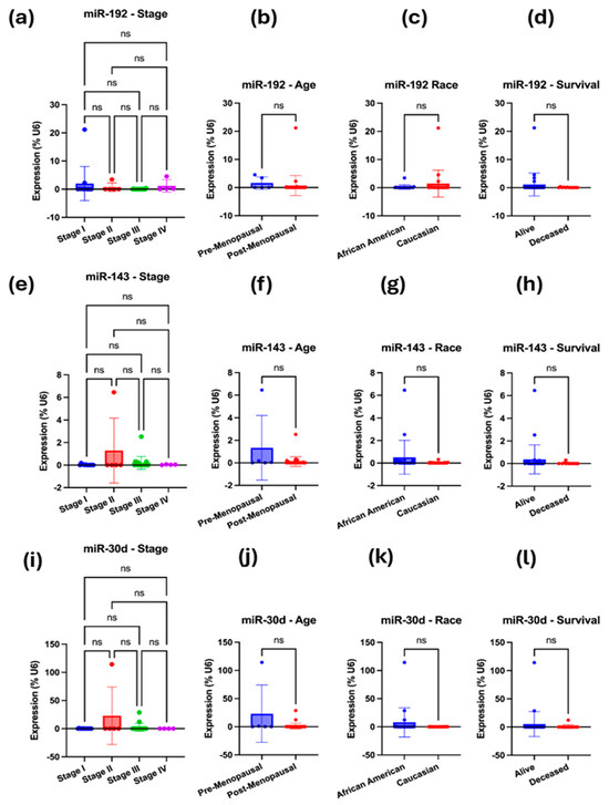 (a–l): qRT-PCR-based gene expression analysis of miR-192, miR-143-5p, and miR-30D. (a–d) Multivariate analysis was performed for miR-192-5p, i.e., expression vs. cancer stage (a), menopausal status (b), race (c), or survival outcome (d). (e–h) Multivariate analysis was performed for miR-143-5p, specifically examining its expression in relation to cancer stage (e), menopausal status (f), race (g), or survival outcome (h). (i–l) Multivariate analysis was performed for miR-30D, examining its expression in relation to cancer stage (i), menopausal status (j), race (k), and survival outcome (l). In each case, the expression was normalized to the U6 reference. A one-way ANOVA or an unpaired t-test with Welch’s correction was performed. Not significant (ns), when the p-value is higher than 0.05.