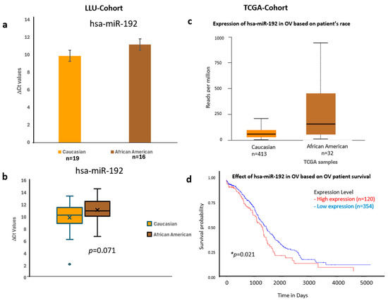 Comparative expression and survival analysis of miR-192 in ovarian carcinoma across LLU and TCGA cohorts. (a–d) miR-192: Panels (a,b) show miR-192 expression in the LLU cohort, comparing Caucasian (n = 19) and African American (n = 16) patients, revealing higher expression in African Americans (ns, p = 0.071). Panel (c) presents TCGA data showing a similar trend toward elevated expression in African American ovarian cancer samples. Panel (d) displays the TCGA survival curve, indicating that higher miR-192 expression is associated with poorer overall survival (* p = 0.021). ns, not significant; *, significant when p < 0.05. Error bars represent mean ± SEM. Statistical analyses were performed using Student’s t-test or log-rank test where appropriate.