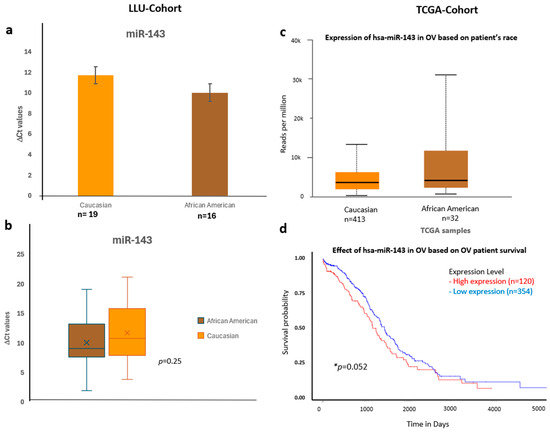 Comparative expression and survival analysis of miR-143 in ovarian carcinoma across LLU and TCGA cohorts. (a–d) miR-143: Panels (a,b) show LLU cohort expression data comparing Caucasian and African American patients (ns, p = 0.25), with TCGA validation in panel (c), which also demonstrates relatively higher miR-143 expression in African American samples. The TCGA survival analysis (d) indicates that elevated miR-143 expression is associated with decreased overall survival (* p = 0.05). *, significant when p < 0.05; ns, not significant; *, Error bars represent mean ± SEM. Statistical analyses were performed using Student’s t-test or log-rank test where appropriate.