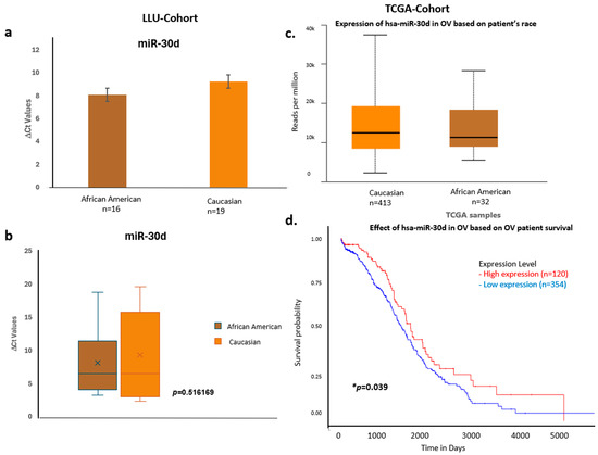 Comparative expression and survival analysis of miR-30d in ovarian carcinoma across LLU and TCGA cohorts. (a–d) miR-30d: Panels (a,b) depict LLU cohort data showing similar miR-30d expression levels across racial groups (ns, p = 0.516), consistent with TCGA data (c), which also show no significant racial difference. The TCGA survival plot (d) shows a significant association between miR-30d expression and overall survival (* p = 0.039). *, denotes significance when p < 0.05. Error bars represent mean ± SEM. Statistical analyses were performed using Student’s t-test or log-rank test where appropriate.