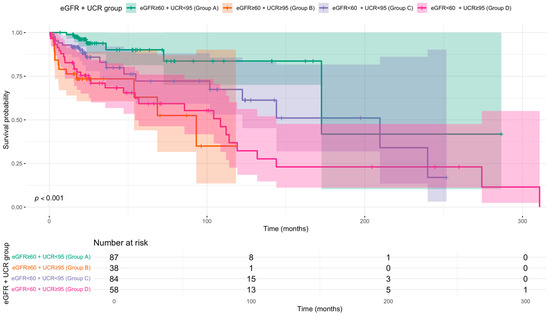 The reference group was Group A (eGFR ≥ 60 + UCR < 95). Compared to this reference, Group B (eGFR ≥ 60 + UCR ≥ 95) had a significantly increased risk of death (HR 4.03, 95% CI 1.50–10.86, p = 0.006). Patients in Group D, who had both an eGFR < 60 and a UCR ≥ 95, also had a significantly elevated risk of mortality (HR 2.85, 95% CI 1.16–7.01, p = 0.023). Notably, patients in Group C, who had an eGFR < 60 but a normal UCR (<95), did not have a statistically significant increase in mortality risk in the adjusted model (HR 2.11, 95% CI 0.84–5.30, p = 0.112).