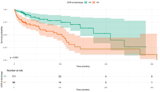 Kaplan–Meier survival curves for all-cause mortality stratified by discharge UCR (<95 vs. ≥95) status. p-value calculated using the log-rank test. Time since diagnosis in months. Shaded areas indicate 95% confidence intervals. Number at risk tabulated below.