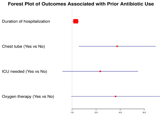 Forest plot of outcomes associated with prior antibiotic use before admission. The plot depicts odds ratios (ORs) and 95% confidence intervals (CIs) for key clinical outcomes. A vertical line at OR = 1 indicates the null effect. Significant associations were observed for chest tube insertion and hospitalization duration, while ICU admission and oxygen therapy showed non-significant trends.