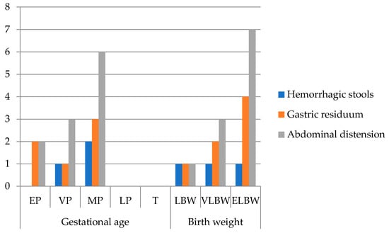 We also identified a statistically significant association between low birth weight and the presence of hemorrhagic stools (p = 0.044), an early sign of NEC or other gastrointestinal disorders. This is consistent with reports indicating a higher incidence of GI bleeding in preterm low-birth-weight infants [].