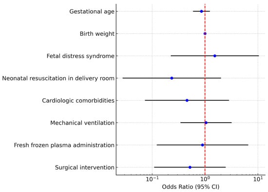A binary logistic regression model was constructed including gestational age, birth weight, fetal distress syndrome, resuscitation in the delivery room, cardiologic comorbidities, mechanical ventilation, fresh frozen plasma administration, and surgical intervention. The overall model was not statistically significant (χ2 test p > 0.05) and explained approximately 23% of the variance (Nagelkerke R2 = 0.23). None of the predictors reached statistical significance as independent risk factors for death (Table 5, Figure 4).