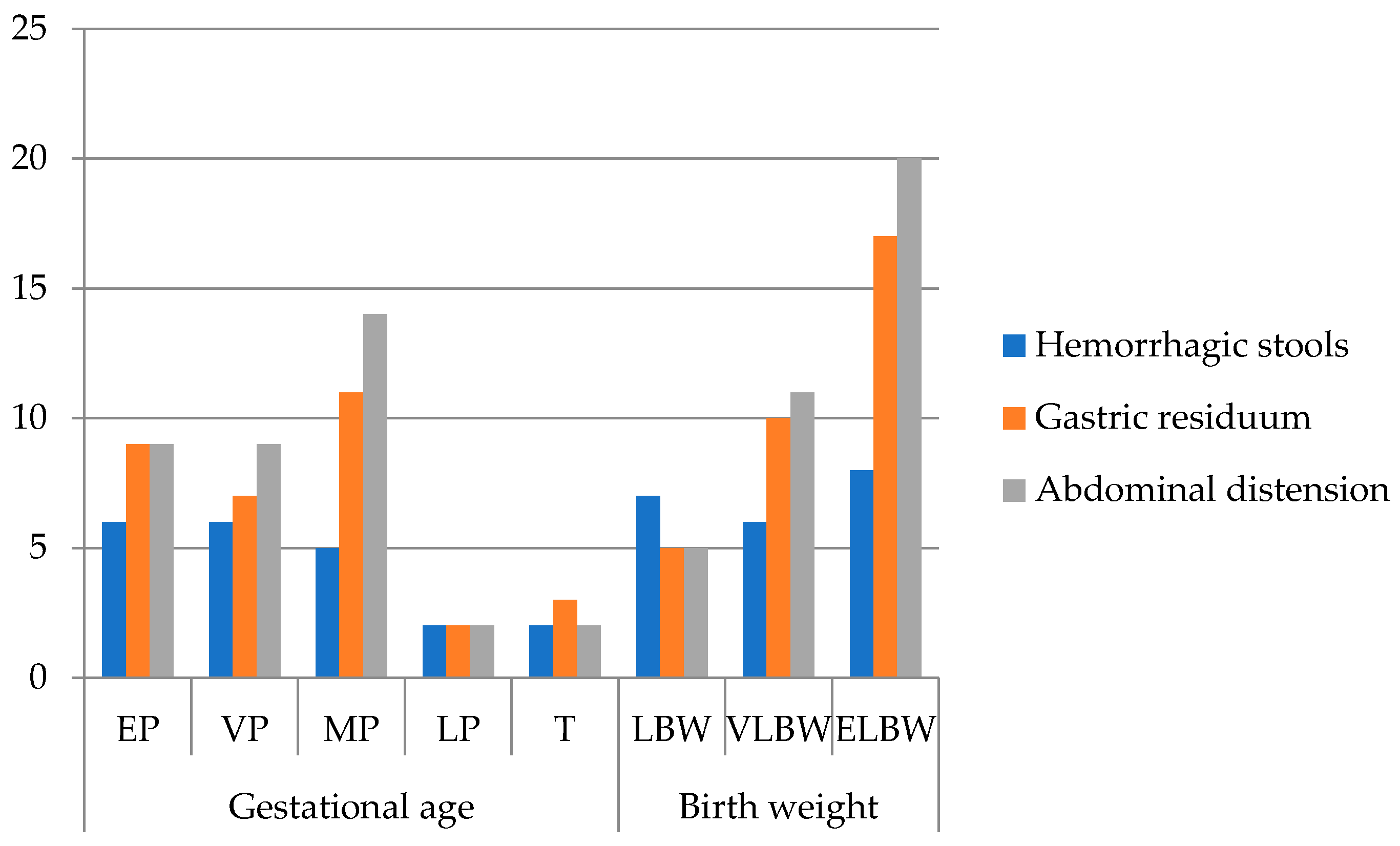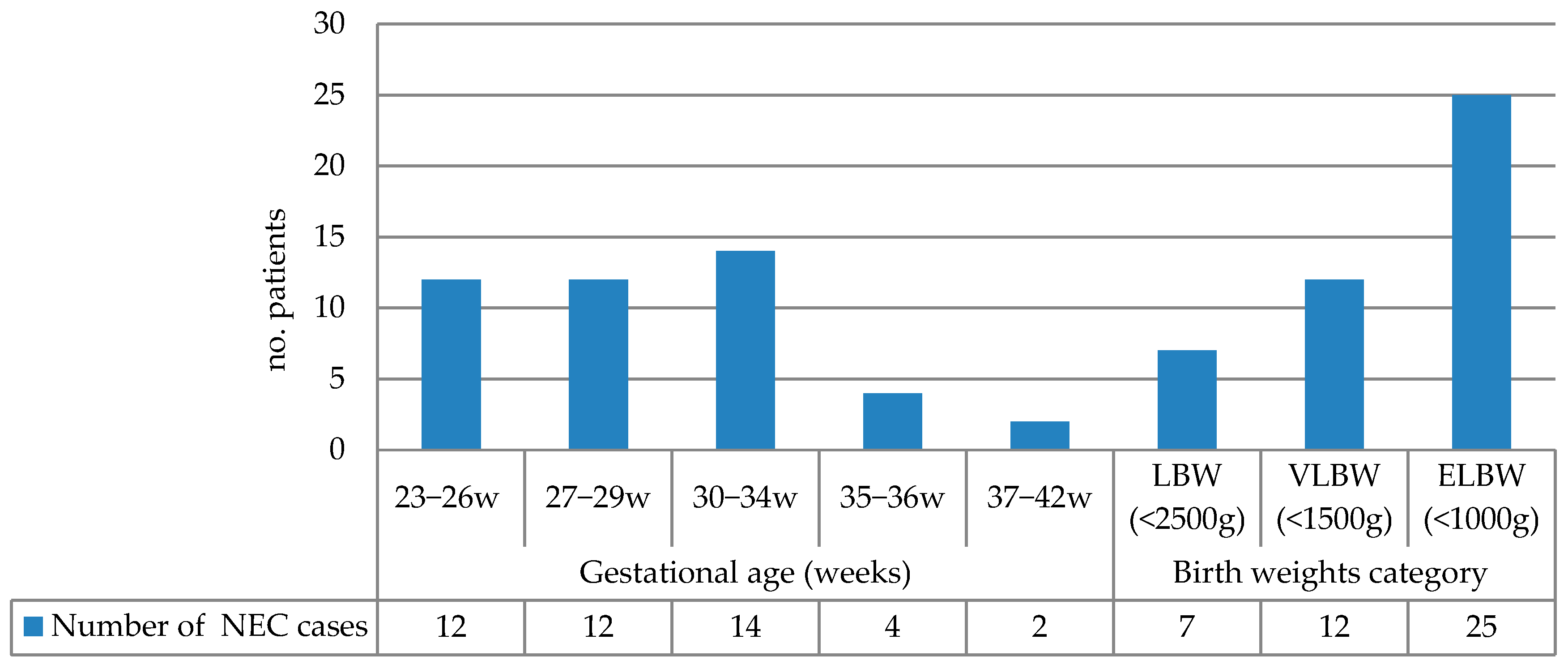 NEC typically manifests during the second and third weeks of life, with an inverse relationship observed between gestational age, birth weight, and the risk of disease onset [10]. Sharma et al., in a cohort of 202 infants, reported NEC incidence rates of 24% in extremely premature (23–26 weeks), 33% in very premature (27–29 weeks), 28% in moderately premature (30–34 weeks), 28% in late preterm (35–36 weeks), and 9% in term infants (37–42 weeks) [11]. Our findings are consistent with these data: 27.3% of our patients were extremely premature (GA < 26 weeks) and 56.8% had an extremely low birth weight. Prematurity, along with its associated low gestational age and birth weight, remains the principal predisposing factor for NEC.