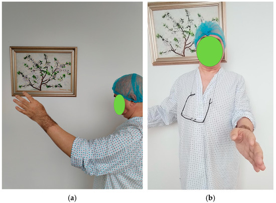 Our patient presented a stable, nonpainful joint with a range of motion (flexion–extension) of 75° in the morning, with an increase of up to 80° during the day. It is known that after waking up from anesthesia, because of pain and muscular contracture, some degrees of motion are lost; for this reason, rehabilitation must begin early, with most recovery happening between 6 weeks and 3 months after surgery [21]. Although the patient was unable to follow the full prescribed rehabilitation plan due to family reasons, at 18 months post-surgery, he has a pain-free joint, a flexion–extension arc of 80°, and pronation and supination are nearly normal, allowing him to carry out daily activities and work (pronation was 80° and supination was 75°). This mobility and stability of the joint currently allow him to do activities such as washing his face, shaving, dressing, combing his hair, and working. The strength of the forearm was quite good, with the patient being able to carry a few kg without problems (maximum was 12 kg) (Figure 6). No adverse or unanticipated events occurred during the follow-up period. The patient did not experience infection, neurovascular complications, prosthesis loosening, or additional fractures.