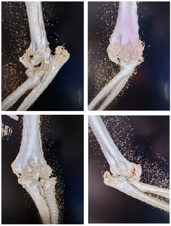 At the time of the injury, the posterior elbow dislocation with associated fractures was not fully diagnosed. The patient initially underwent closed reduction and cast immobilization, but the original radiographs taken immediately after the trauma and following the first reduction were unavailable. Radiographs obtained at the time of admission to our clinic were inconclusive due to extensive heterotopic ossification, prompting a 3D computed tomography (CT) scan to better visualize the bony anatomy and the joint relationships (Figure 2). The CT scan revealed a chronic posterior elbow dislocation with a large heterotopic bone mass within the joint. The coronoid process of the ulna was no longer discernible, suggesting resorption or fragmentation at the time of injury. The radial head was severely deformed (Masson 3), preventing normal articulation with the capitulum and functionally blocking the proximal radioulnar joint.
