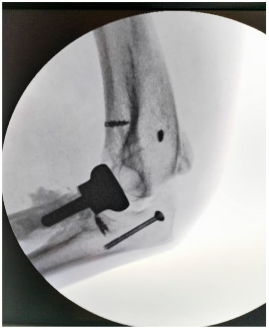 Considering the high risk of postoperative instability, we preferred the two-approach technique—lateral and medial—in order to preserve the integrity of the triceps tendon. Based on our experience and the existing literature, this method reduces the risk of joint instability and maintains the muscular strength of the elbow extensor mechanism [12,13,14,15]. The combined medial and lateral approach allowed removal of a large anterior ossification (Figure 3) and cleaning of the posterior compartment, while preserving the triceps insertion to maintain postoperative stability. After releasing all soft tissues from bone, except the triceps insertion, and clearing the articular surfaces of adhesions, the anterior capsule was anchored to the coronoid process using two anchors to prevent posterior dislocation. The common extensor tendons were detached from the distal humerus, as they were retracted and obstructed visualization and removal of intra-articular ossification.