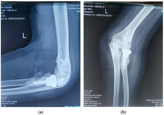 - Faqih, E.; Sawan, H.; Alfadhel, S.F.; AlAbbasi, K.; Alrawi, M. Chronic Complex elbow fracture dislocation: Restoration of elbow function with ORIF and radial head replacement, a case report with long term follow up. Int. J. Surg. Case Rep. 2023, 112, 108912. [Google Scholar] [CrossRef] [PubMed]