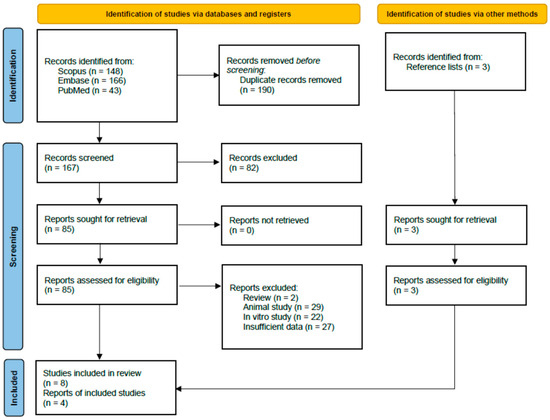 The systematic literature search identified a total of 360 records from PubMed (43), Embase (166), Scopus (148), and Supplementary Sources (3). After the removal of 190 duplicates, 170 unique records were screened based on title and abstract, leading to the exclusion of 82 records that were irrelevant to the research question. The full texts of the remaining 88 articles were retrieved and assessed for eligibility. Of these, 80 were excluded for various reasons: 2 were review articles without original data, 29 were animal studies, 22 were in vitro studies, and 27 were insufficient data for analysis. Eight studies met inclusion criteria for qualitative systematic review (Table 1), meaning they reported IL-6 measurements in culture-confirmed melioidosis with mortality outcomes. However, only four studies [10,11,12,13] provided survival-stratified IL-6 data in a format enabling calculation of standardized mean differences (means/medians with measures of dispersion for both survivor and non-survivor groups). The remaining four studies were excluded from meta-analysis for the following reasons: (1) Simpson 2000 endotoxin substudy [18] and LaRosa 2006 [19] analyzed overlapping patients from the Simpson 2000 main cohort [11], (2) Saikh 2020 [20] compared melioidosis patients to controls but did not stratify IL-6 by survival outcome, and (3) Wan 2025 [21] was a descriptive case series of three pediatric patients, all fatal, precluding comparison group analysis. The detailed study selection process is illustrated in the PRISMA flow diagram (Figure 1).