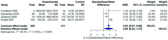 We performed a random effects meta-analysis (DerSimonian–Laird model with Hartung–Knapp adjustment) to estimate the standardized mean difference (SMD) in plasma IL-6 concentrations between non-survivors and survivors across eligible studies. The pooled SMD was 0.80 (95% CI: 0.02–1.57), indicating that IL-6 levels were significantly higher in non-survivors than in survivors (I2 = 86.3%, τ2 = 0.1956, p < 0.0001). As shown in Figure 2.