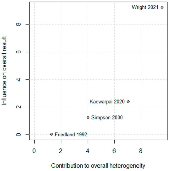 Baujat diagnostic plot assessing individual study contributions to heterogeneity and pooled effect estimate. The x-axis represents each study’s contribution to overall heterogeneity (Cochran’s Q statistic); the y-axis represents influence on the pooled SMD [10,11,12,13]. Studies positioned toward the upper right exert disproportionate influence on both heterogeneity and pooled estimate. Wright 2021 [13] contributes most to heterogeneity (x ≈ 9) due to its large sample size (n = 352) and methodological differences (electrochemiluminescence assay), making it an appropriate candidate for sensitivity analysis. This diagnostic plot helps identify outlier studies that may warrant separate consideration.