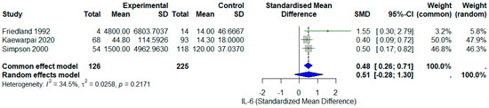 Meta-analysis was performed using random effects models based on the DerSimonian–Laird method to account for anticipated heterogeneity across studies arising from differences in patient populations, clinical settings, assay methodologies, and other study characteristics. This approach provides more conservative estimates than fixed-effects models and is more appropriate when substantial between-study heterogeneity is expected. When studies reported IL-6 concentrations as continuous variables, standardized mean differences (SMDs) with 95% confidence intervals were calculated to enable comparison across studies using different units or assay platforms. For studies providing dichotomous databased on predetermined IL-6 thresholds, pooled odds ratios were computed using the Mantel-Haenszel method.