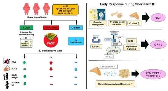 Rachmayanti, D.A.; Rejeki, P.S.; Argarini, R.; Novida, H.; Soenarti, S.; Halim, S.; Permataputri, C.D.A.; Purnomo, S.P. Effects of Short-Term (20-Day) Alternate-Day Modified Fasting and Time-Restricted Feeding on Fasting Glucose and IGF-1 in Obese Young Women. Diseases 2025, 13, 390. https://doi.org/10.3390/diseases13120390