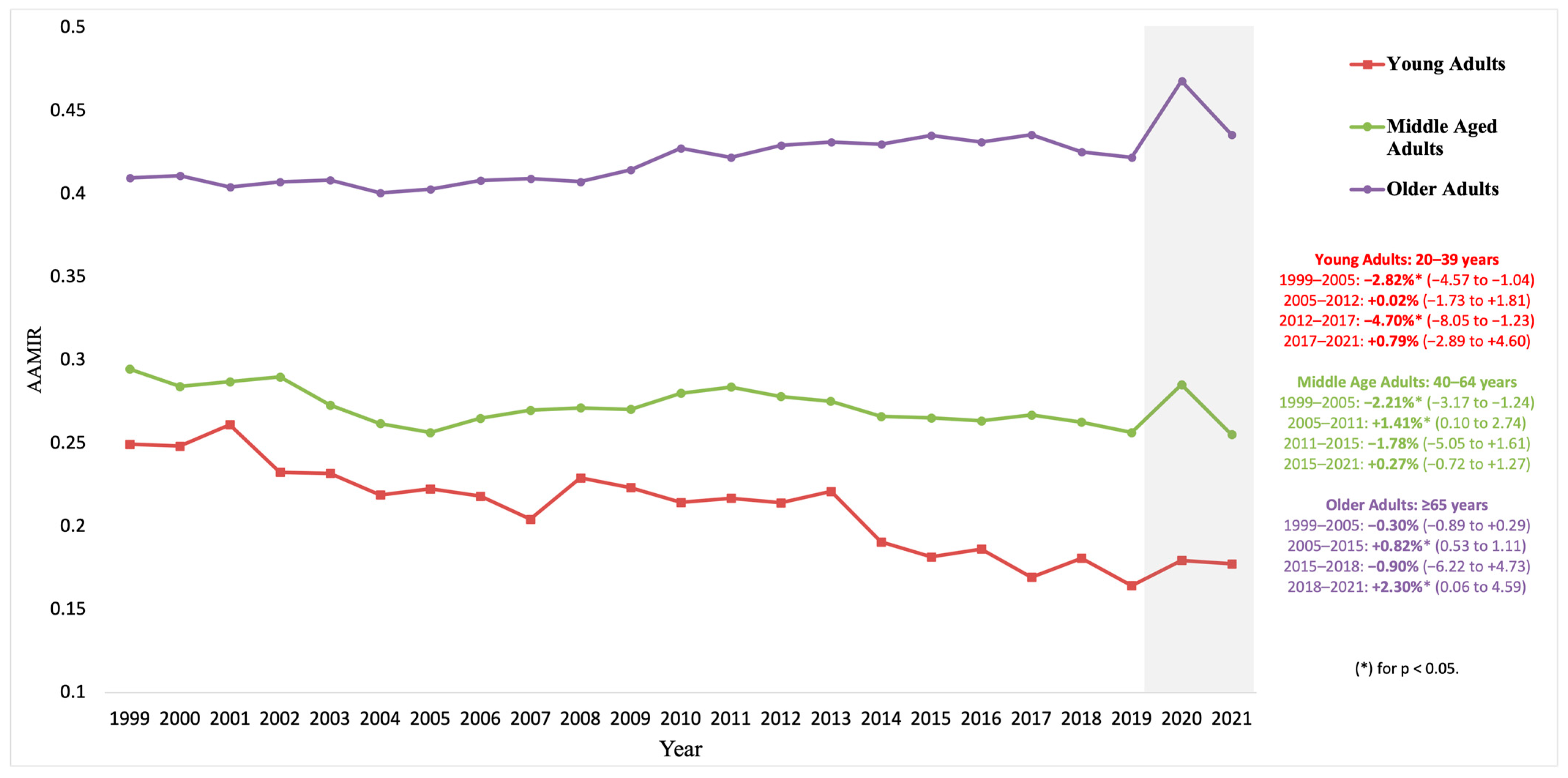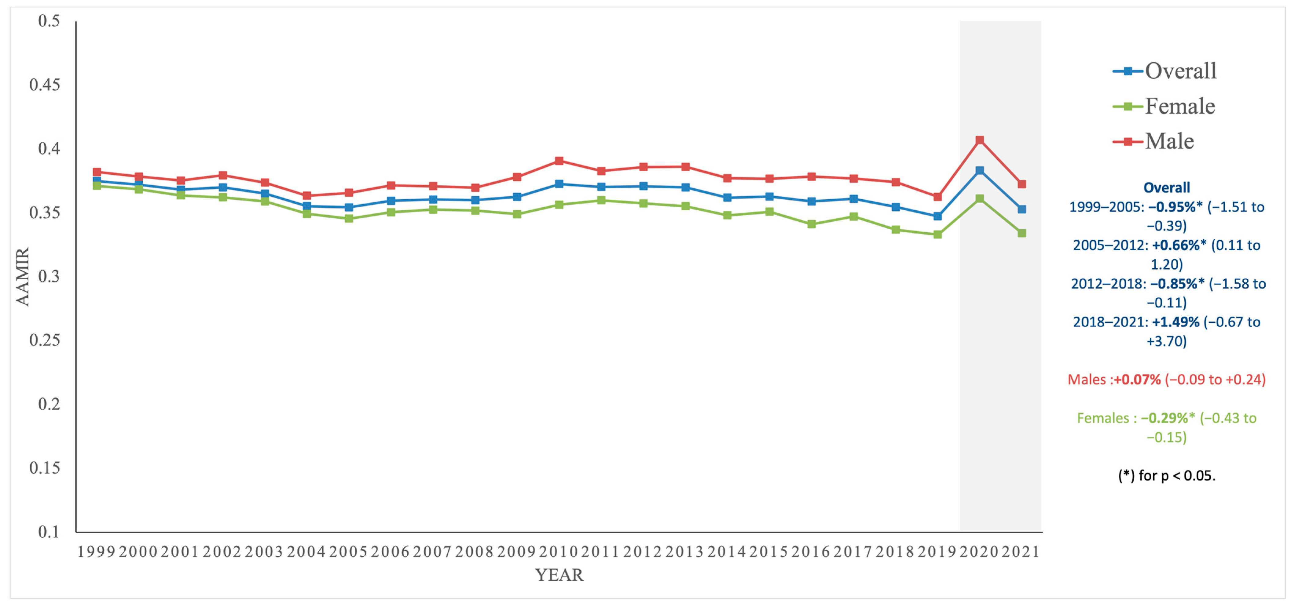 | Subgroup | AAIR (1999) | AAIR (2021) | AAPC AAIR (95% CI) | AAMR (1999) | AAMR (2021) | AAPC AAMR (95% CI) | AAMIR (1999) | AAMIR (2021) | AAPC AAMIR (95% CI) |