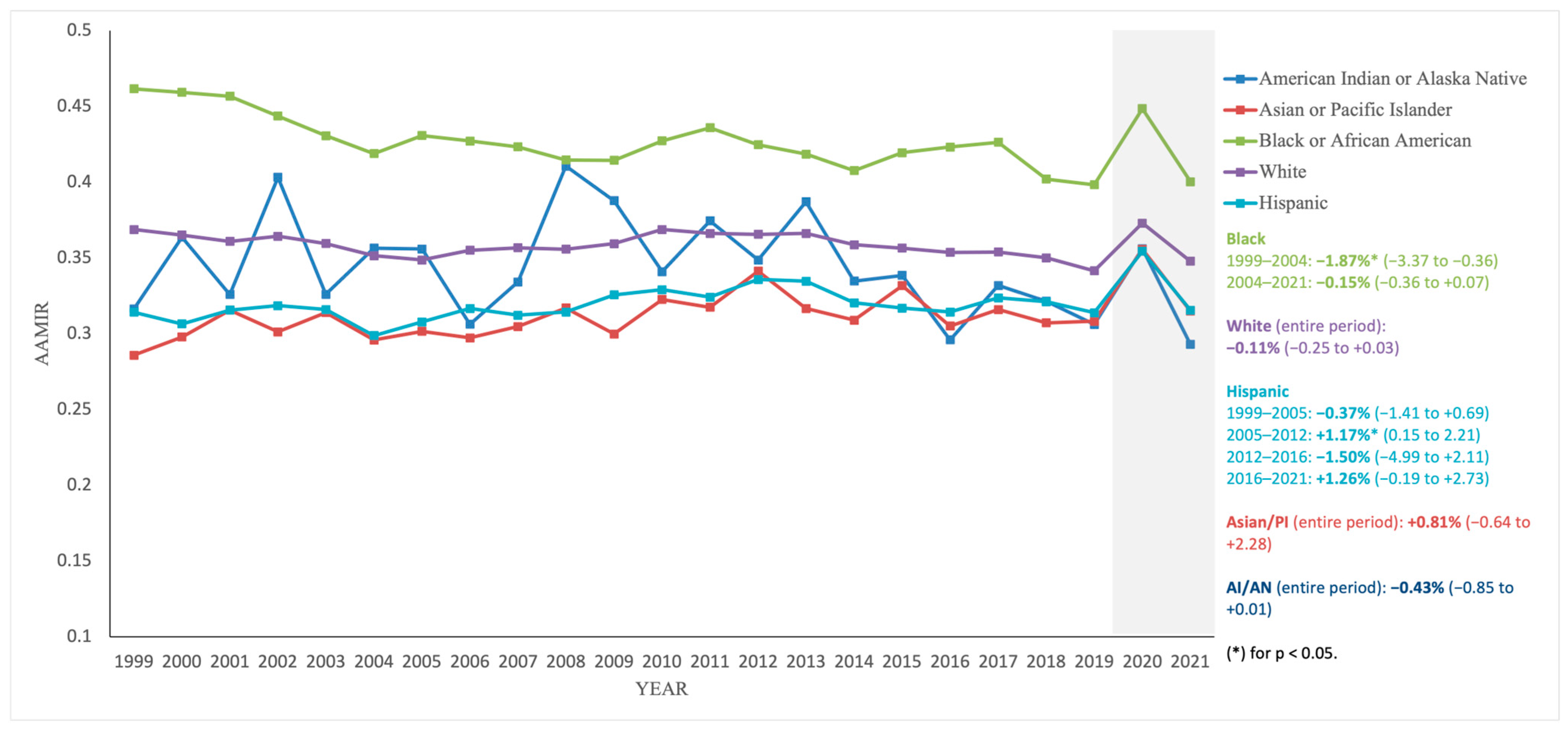 | Non-Hispanic Asian/Pacific Islander | 59.44 | 41.55 | −2.07 (−2.31, −1.82) * | 16.99 | 13.08 | −1.73 (−1.95, −1.50) * | 0.286 | 0.315 | 0.81 (−0.64, 2.28) |