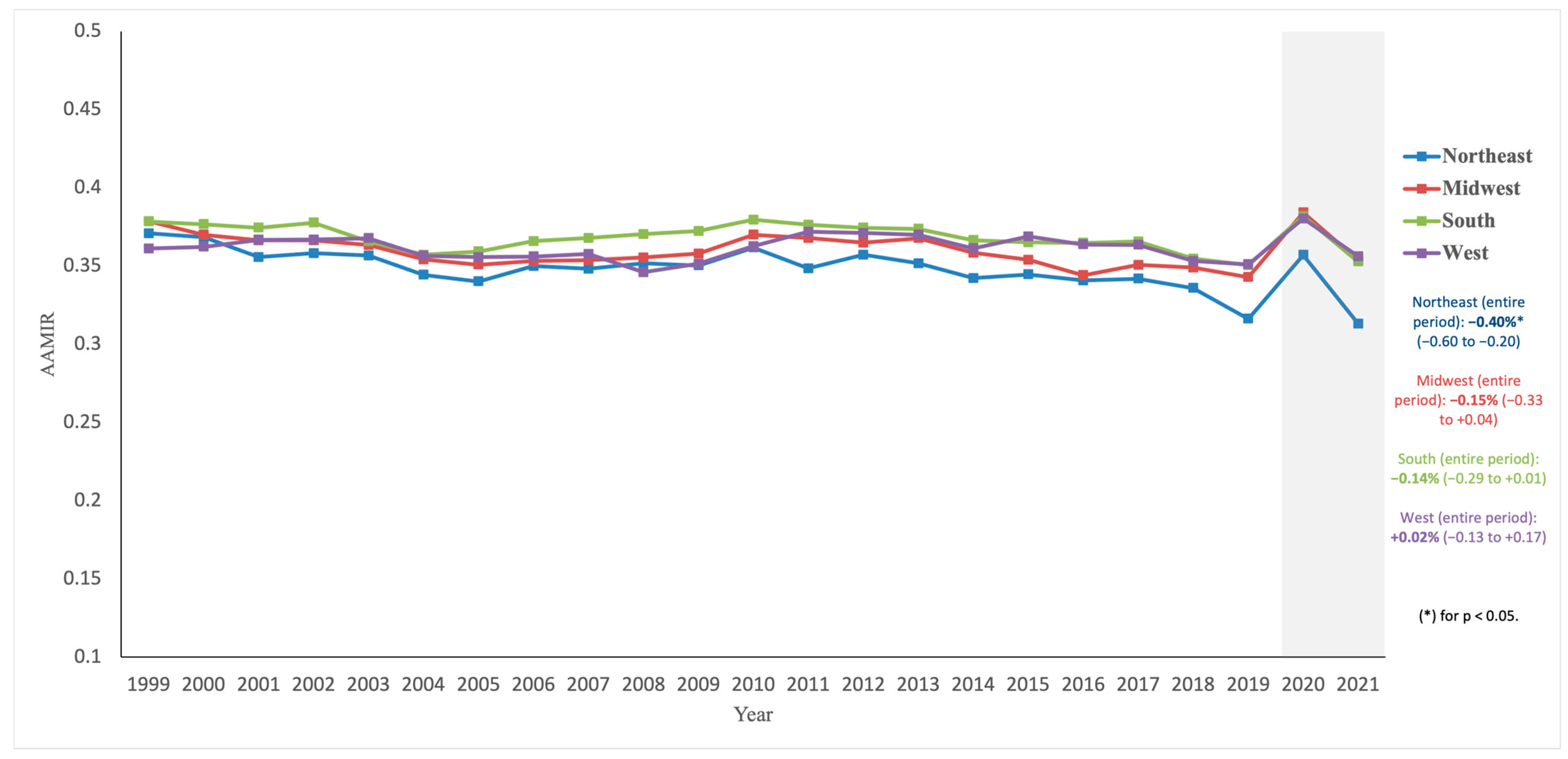 | Midwest | 82.21 | 53.34 | −2.16 (−2.52, −1.79) * | 31.12 | 18.86 | −2.36 (−2.51, −2.20) * | 0.379 | 0.354 | −0.15 (−0.33, 0.04) |